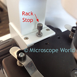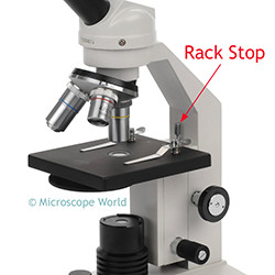 Student Microscope Rack StopMicroscope rack stop imageRack Stop (or Safety Rack Stop): Usually set at the factory, the rack stop keeps you from cranking the objective lenses too far down and damaging either the objective lens or the microscope slide. If you are using a very thin slide, you may find that you can't get the high power objective lens close enough to the slide to focus. Here you can either adjust the rack stop or place a thin glass slide under your original slide, making it closer to the lens. Microscope rack stops are commonly found on high school student microscopes in order to keep students from damaging objective lenses.